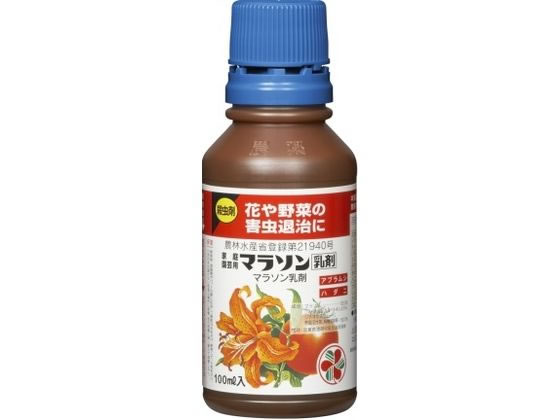 【商品説明】野菜から草花まで幅広く使える家庭園芸の代表的な殺虫剤【仕様】●農林水産省登録:第21940号●農薬の種類・名称:マラソン乳剤・家庭園芸用マラソン乳剤●有効成分の種類と含有量:マラソン【ジメチルジカルベトキシエチルジチオホスフェート】:50.0%・界面活性剤、有機溶剤等:50.0%●内容量:100ml