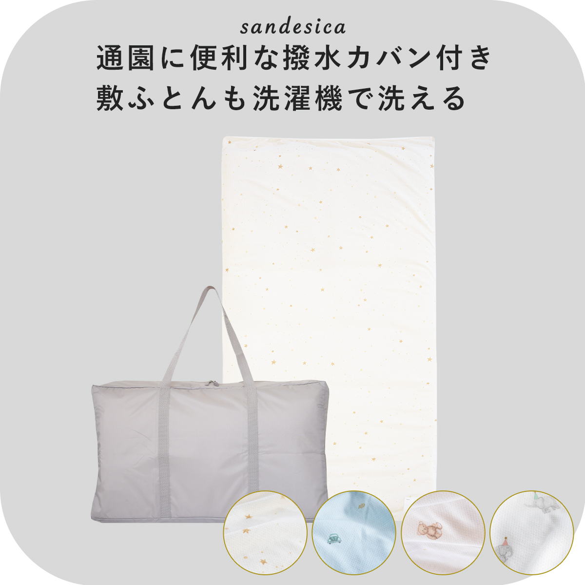 | 素材 | 敷ふとん:側地=ポリエステル100%、詰めもの=ポリエステル100% 敷ふとんカバー:綿100% 撥水カバン:ポリエステル100%(撥水加工) |