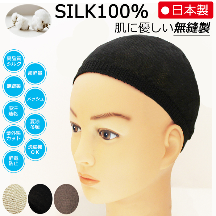 【超軽量10g】天然シルクメッシュ無縫製インナーキャップ【洗えるシルク】【日本製】【消臭】【メール便送料無料】医療用帽子 医療用ウィッグ