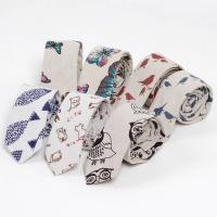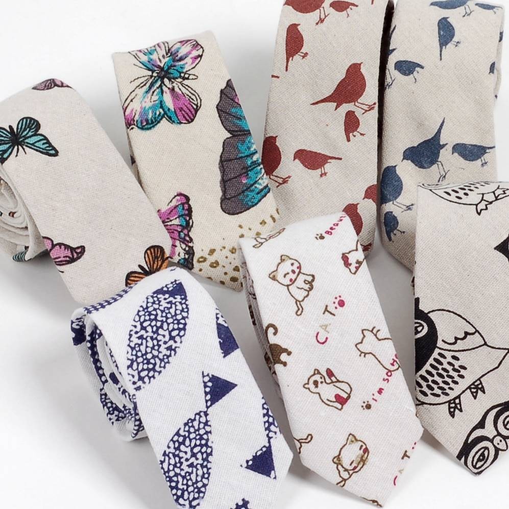 ネクタイ メンズ 生き物 猫、鳥、蝶 リネン コットン素材 おしゃれ 淡い色合いの感じ 自然モチーフ 大剣幅 6cm スリム・ナロータイ
