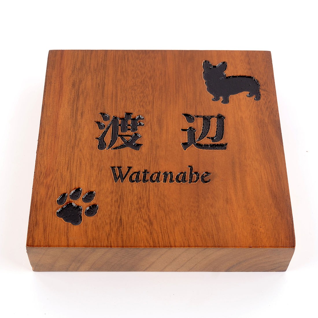 ご自宅などの戸建でご利用いただくのに最適なサイズの天然木の表札です。大事な家族の一覧である愛犬のシルエットを入れることができます。犬種は一覧からお選びいただけます。3CMの厚さがありますので重厚感があります。