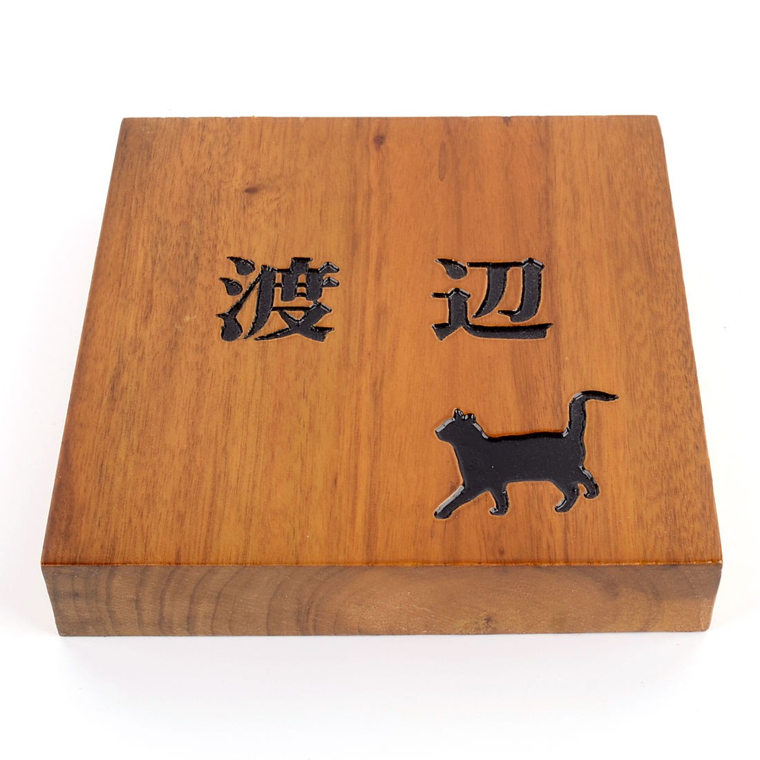 表札のアトリエ 天然木 150x150x30mm ライトブラウン にゃんこと一緒 墨入れニス仕上げ全て込み 横型