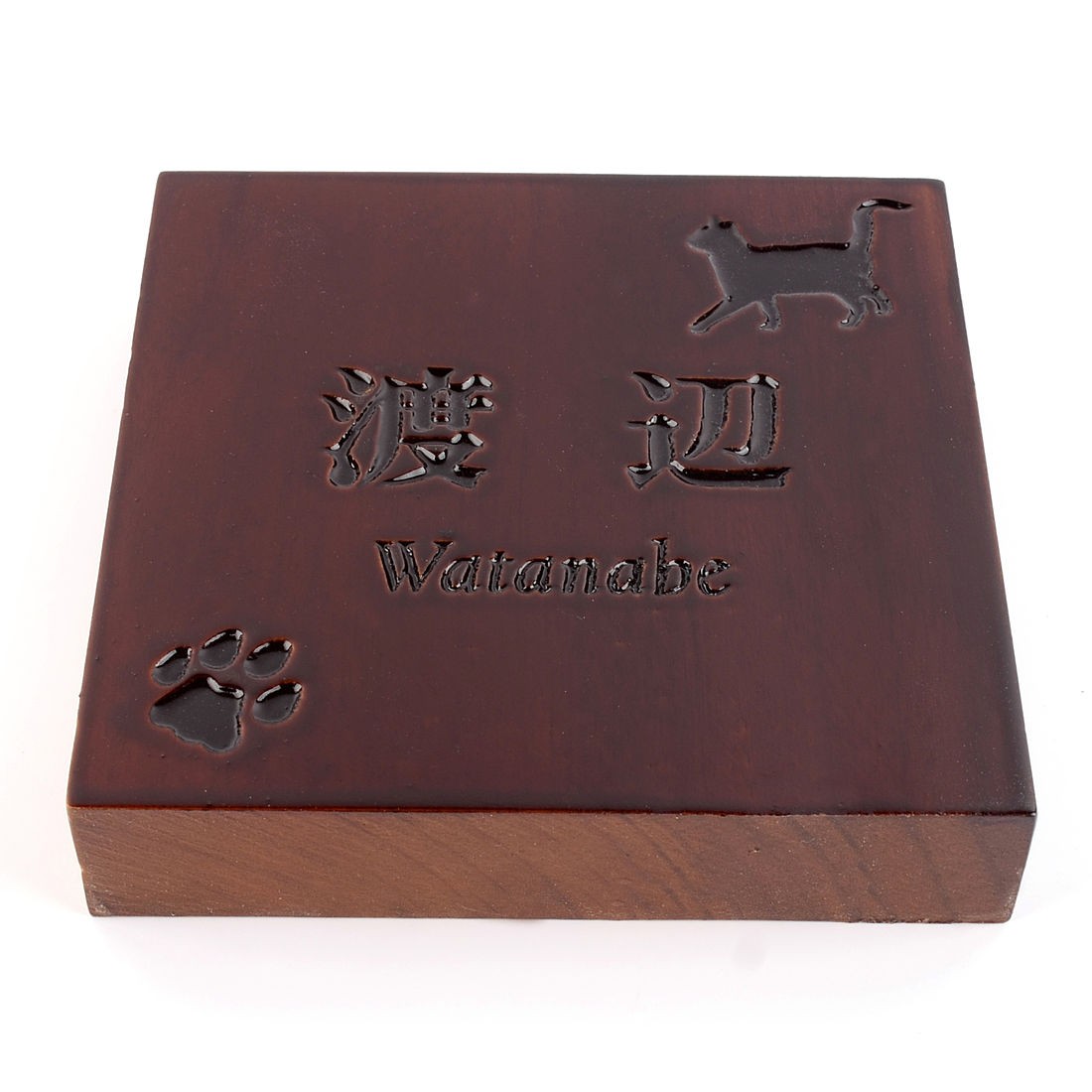 表札のアトリエ 天然木 150x150x30mm ダークブラウン にゃんこと一緒 肉球付き2 墨入れニス仕上げ全て込み 横型