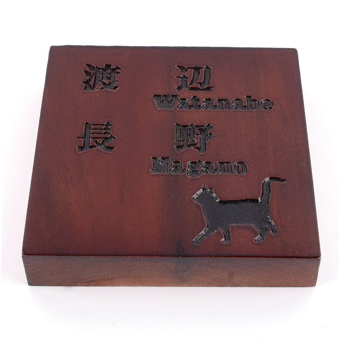 表札のアトリエ 天然木 150x150x30mm ダークブラウン にゃんこと一緒 二世帯用2 墨入れニス仕上げ全て込み 横型