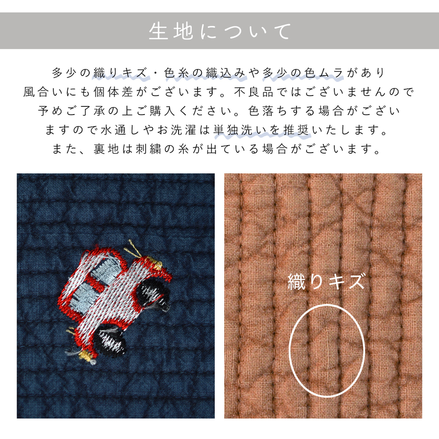 1.素材の特性上、生地に綿カス(黒い粒)、ツブやネップが残っている場合がございます。