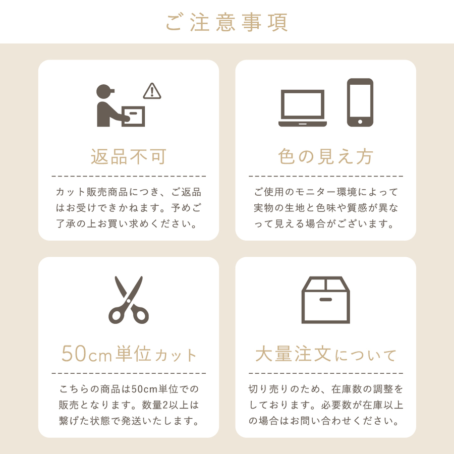 色味・質感が理由での返品・交換を承ることは出来ません。