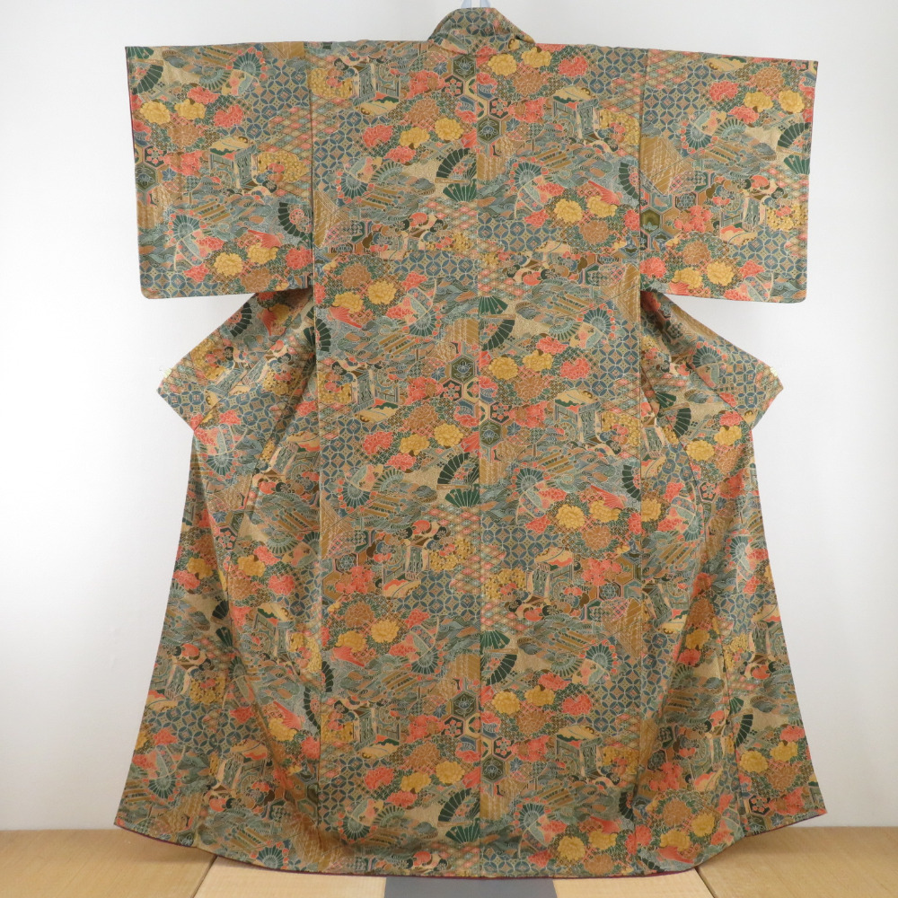 小紋 裂取文様柄 袷 広衿 茶黄色 正絹 仕立て上がり カジュアル着物 身丈158cm