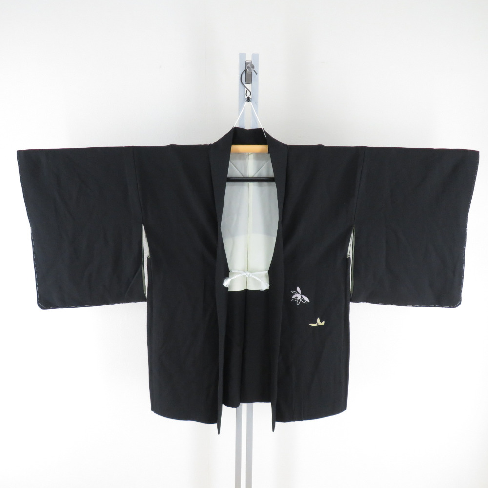 羽織 正絹 友禅染 芝草に菖蒲 黒色 絵羽柄 一つ紋 着物コート 和装 ちりよけ 身丈81cm