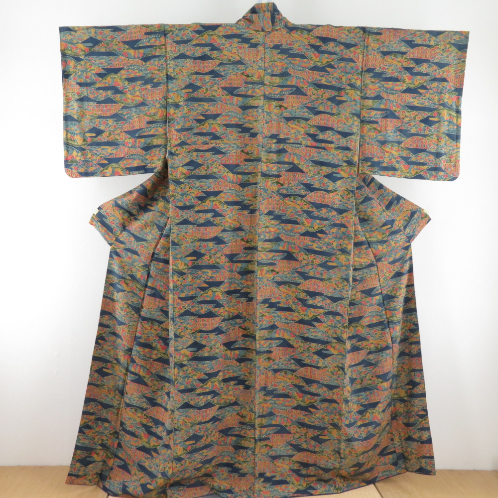小紋 山並みに花文様 袷 広衿 紺色 正絹 仕立て上がり カジュアル着物 身丈157cm