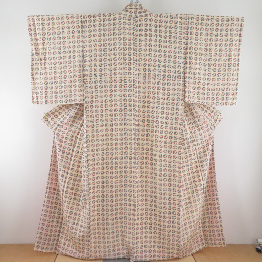 小紋 丸に紅葉文様 袷 広衿 ベージュ色 正絹 仕立て上がり カジュアル着物 身丈157cm