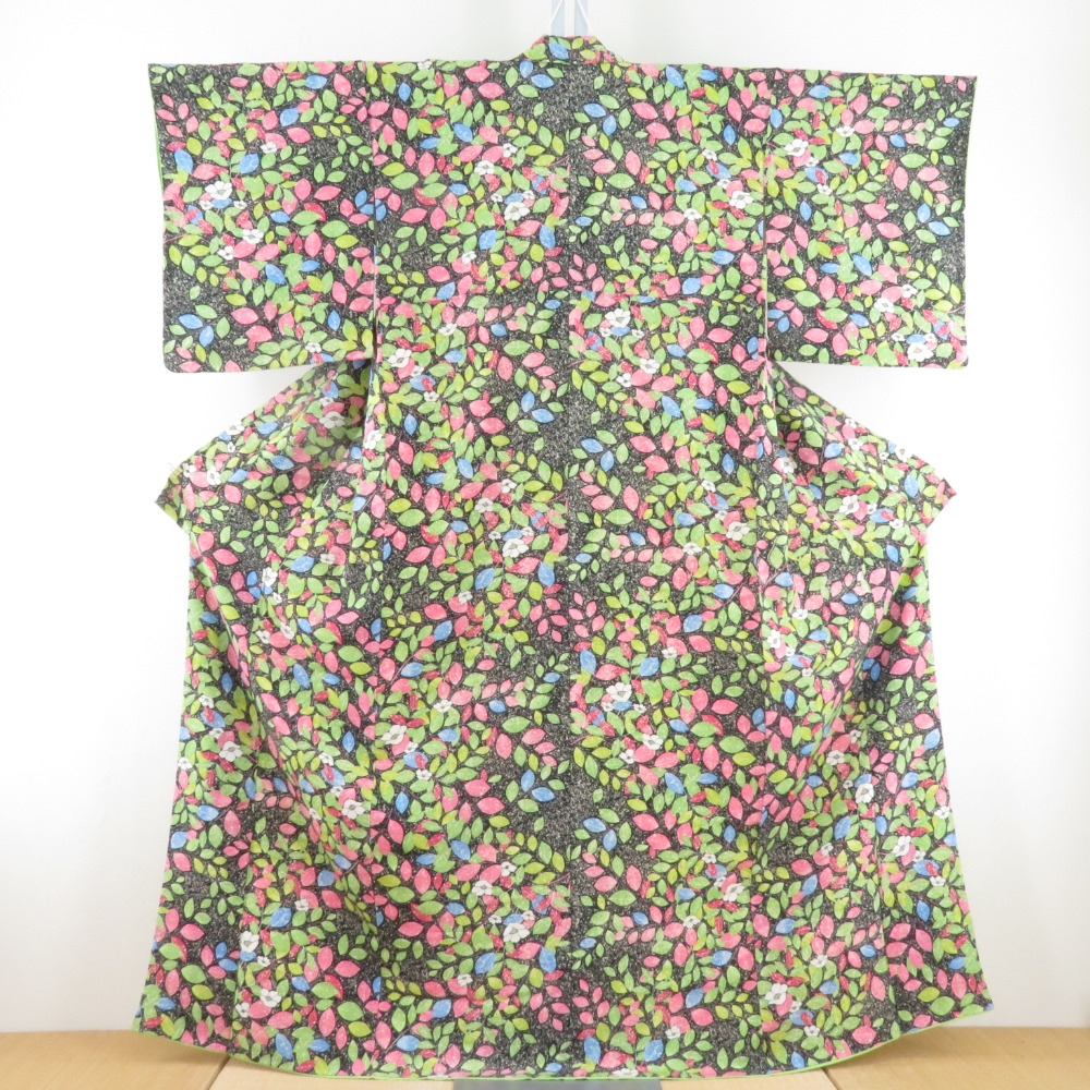 小紋 椿文様 たたき染め 袷 バチ衿 黒色 正絹 仕立て上がり カジュアル着物 身丈161cm
