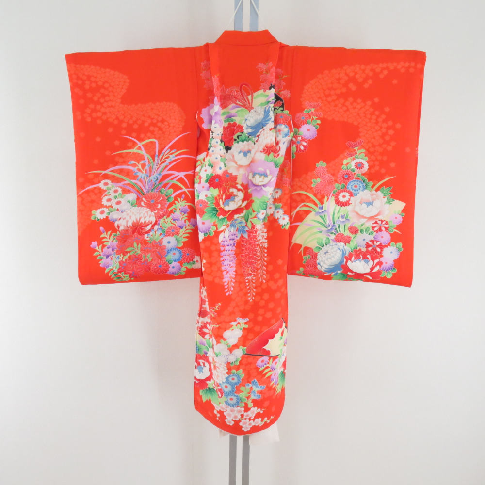 子供着物 女の子用 一つ身 襦袢とセット オレンジ色x多色 花々文様 フォーマル 女児 七五三 祝着 子供きもの 身丈94cm