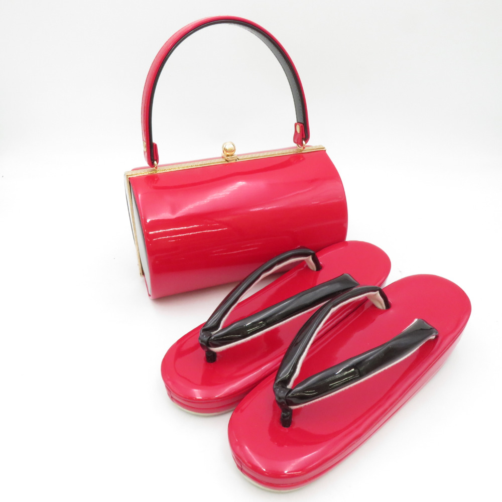 美しいエナメルの草履バッグセットでございます。レッドカラーがとても印象的です。