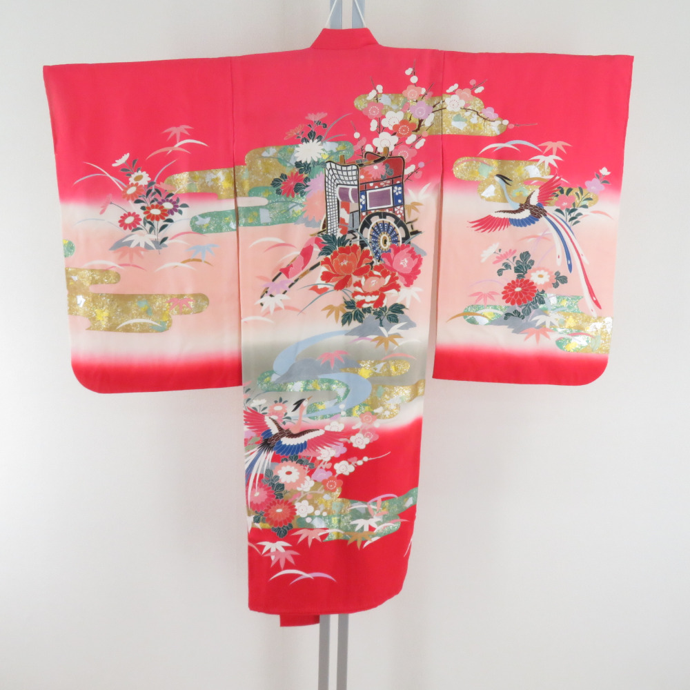 子供着物 女の子用 一つ身 赤ピンクx多色 表正絹 裏ポリエステル 御所車に花々文様 フォーマル 女児 七五三 祝着 子供きもの 身丈95cm