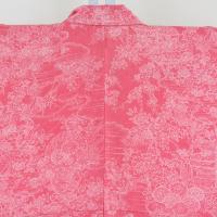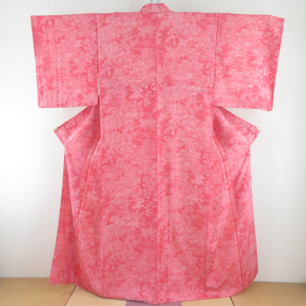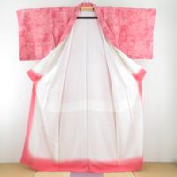 小紋 赤ピンクx白色 花籠模様 正絹 袷 広衿 仕立て上がり着物 身丈157cm