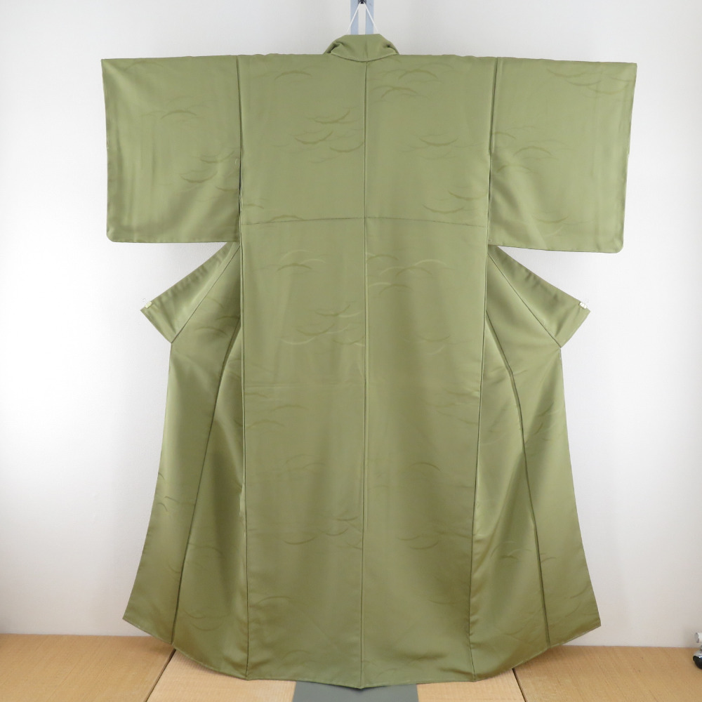 夏着物 色無地 袷 広衿 ポリエステル 黄緑色 紋無し 芝草地紋 仕立て上がり 身丈155cm