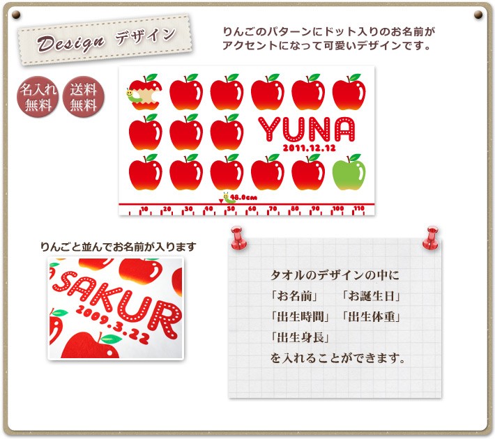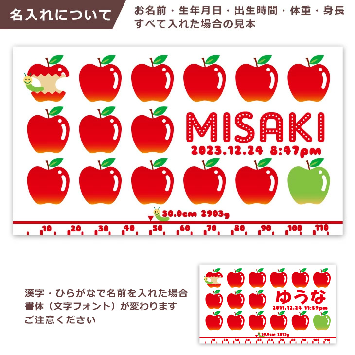 ドット入りのお子様のお名前がりんごと並んで入ります。