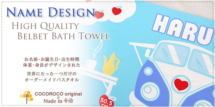 出産祝いの贈り物として喜ばれるお名前入りの今治製バスタオルです。