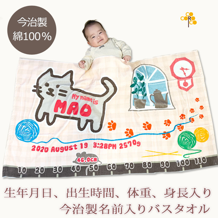 【約30営業日出荷】 出産祝い 名入れ 名前入り バスタオル 男の子 女の子 おしゃれ お七夜 100日祝い 今治 日本製 ブランケット プレゼント 手描き風 ネコ 猫