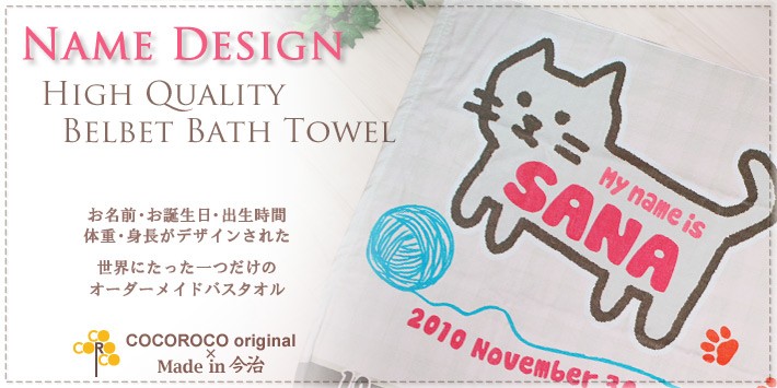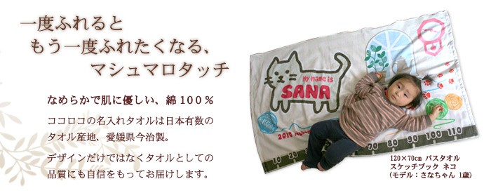 かわいい「ネコ」の絵柄のお名前入りの今治製バスタオルです。