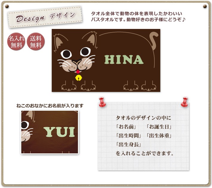 「ネコ」デザインの名前入りの今治製バスタオルです。