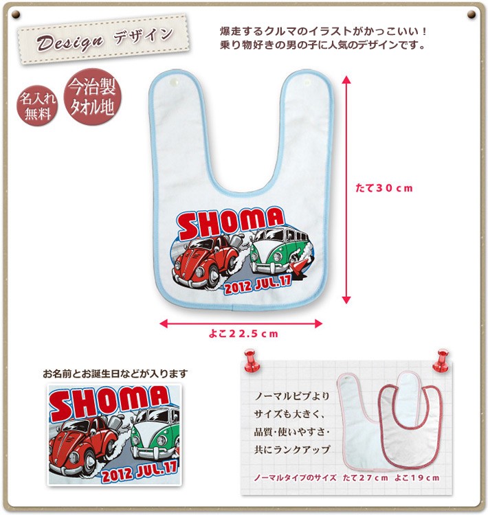 自動車 カーレースと一緒に赤ちゃんのお名前、誕生日、出生時間、体重、身長が入ります。名入れ無料。
