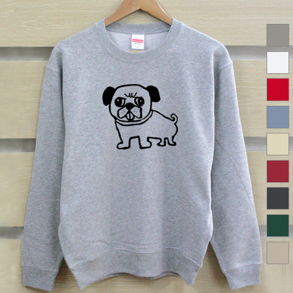 子犬のパグのイラストが入るスウェットです。イヌ好きの方にピッタリ!