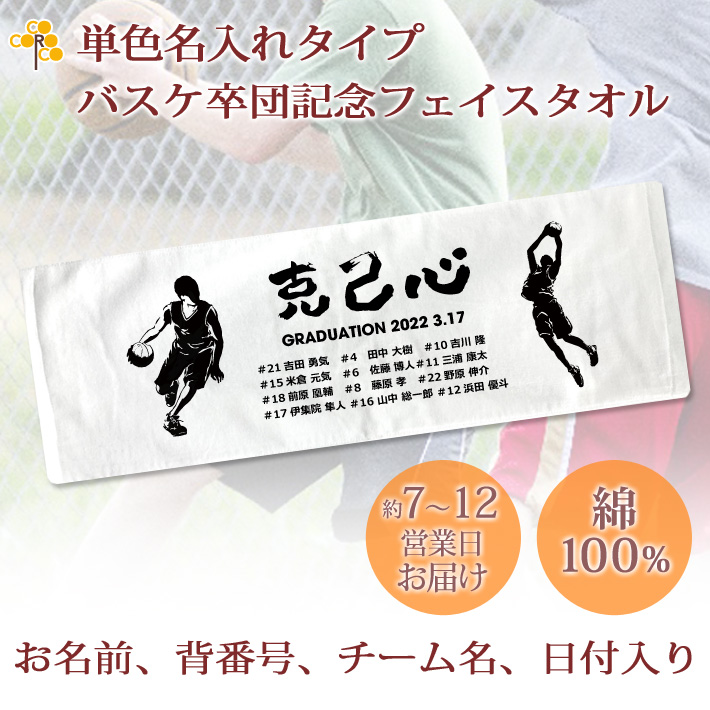 バスケットボール 卒団記念 【単色名入れタイプ(背景は白)10枚以上購入で1枚2,980円&12営業日出荷OK】スローガン 名前 背番号 今治製 プチフェイスタオル