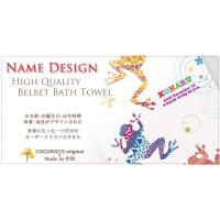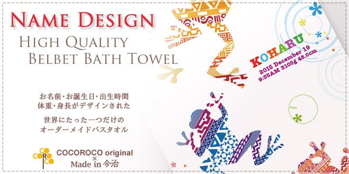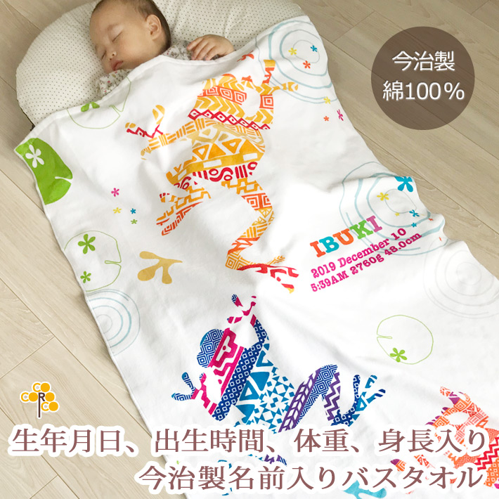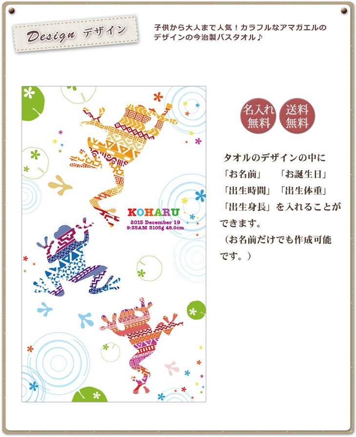 オリジナルブランド「KITCY」のカラフルなカエルのデザインにお名前が入る今治製バスタオル(サイズ120cm×70cm)です。誕生日、生年月日、出生時間、出生身長・体重も入ります♪