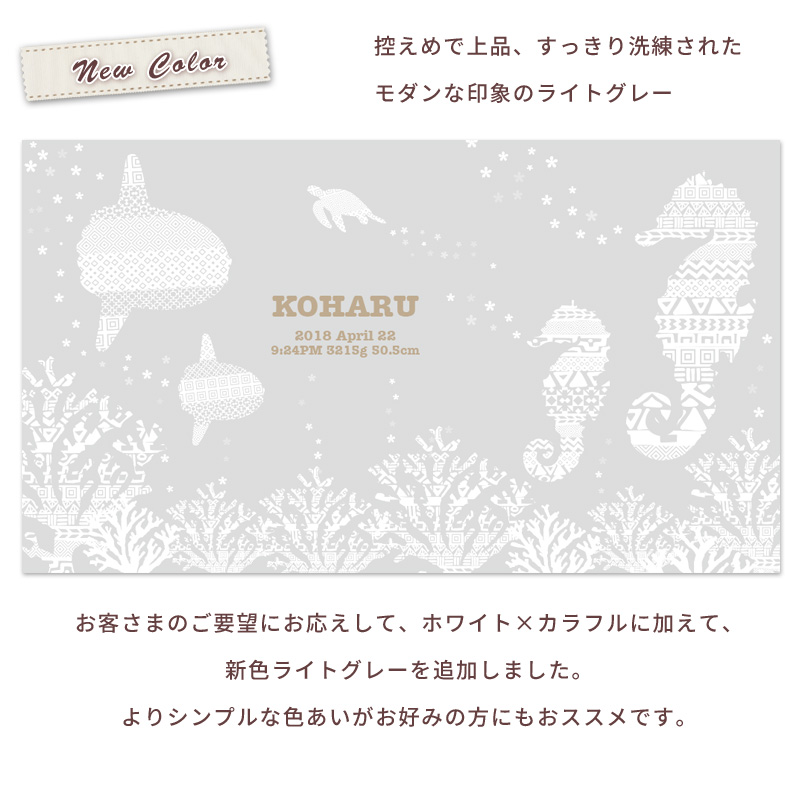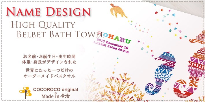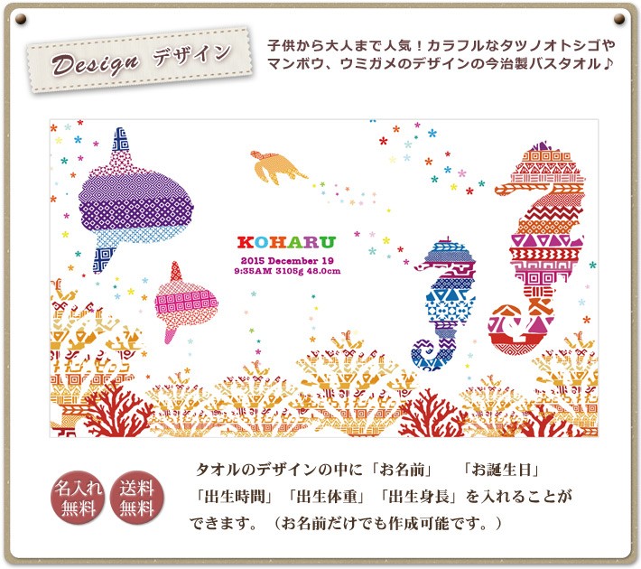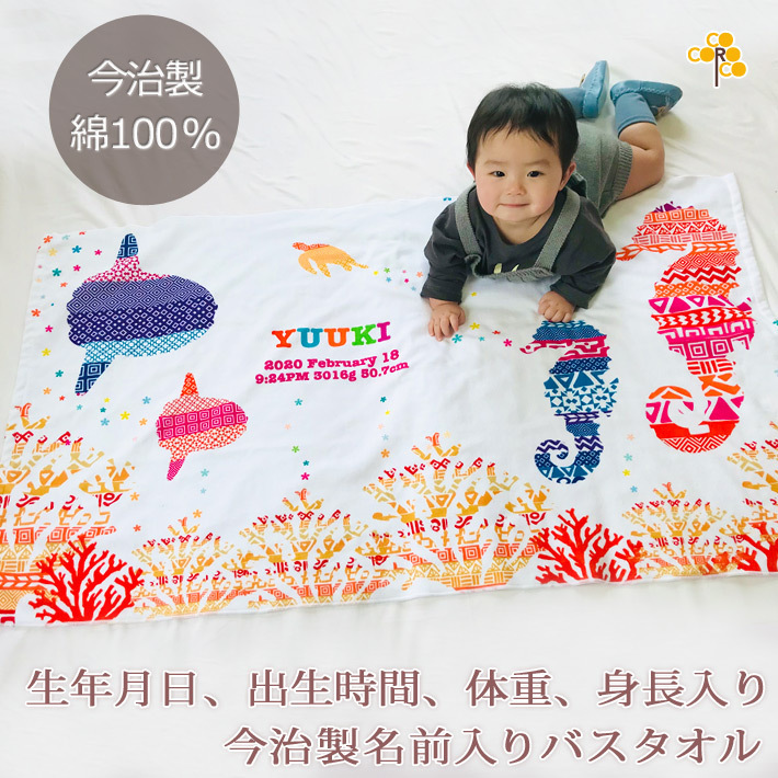 オリジナルブランド「KITCY」のカラフルなタツノオトシゴやマンボウのデザインにお名前が入る今治製バスタオル(サイズ120cm×70cm)です。誕生日、生年月日、出生時間、出生身長・体重も入ります♪