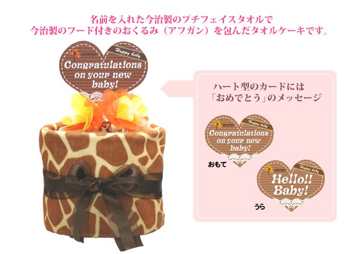 タオルケーキには「おめでとう」の意味を込めたハートのカードが付属します♪