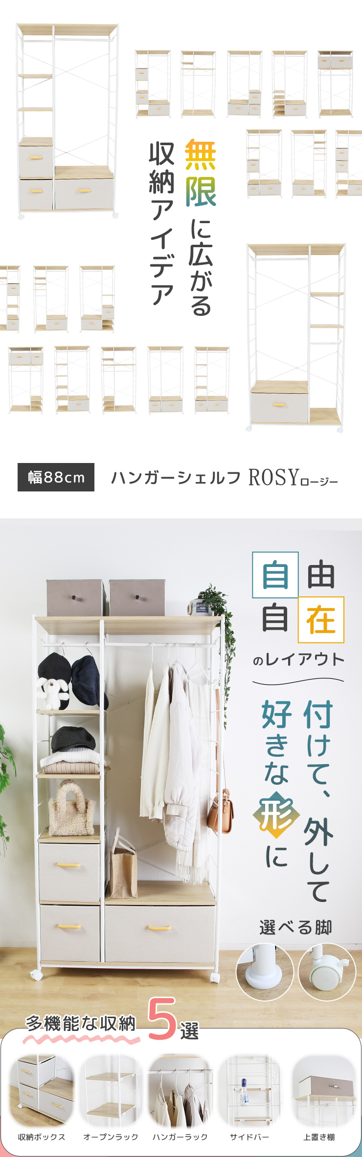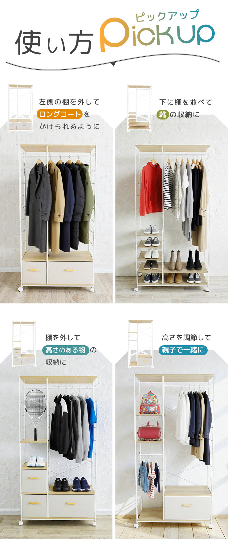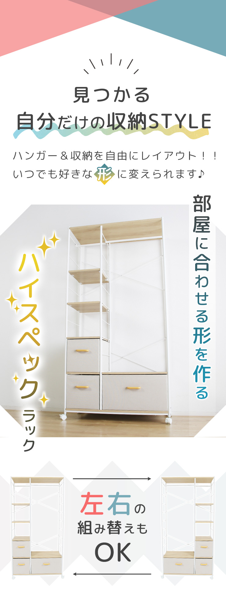 ハンガーシェルフ ハンガーラック ワードロープ 収納 おしゃれ シンプル 頑丈 キャスター 棚付き 上棚 引き出し ケース 大容量 マルチ 可動棚 高さ調節