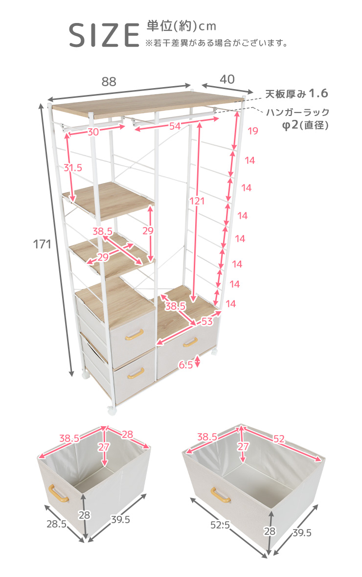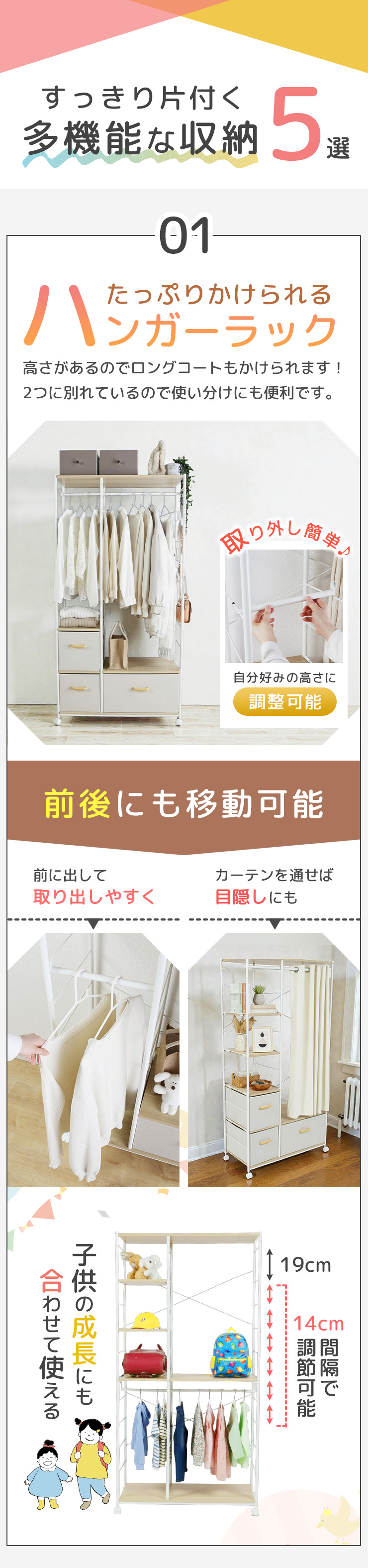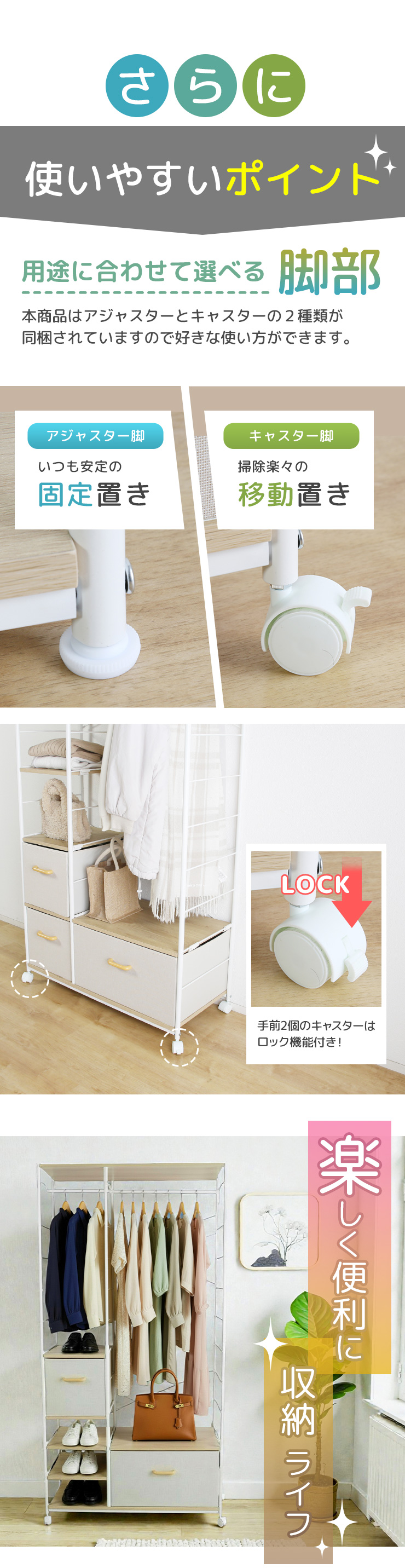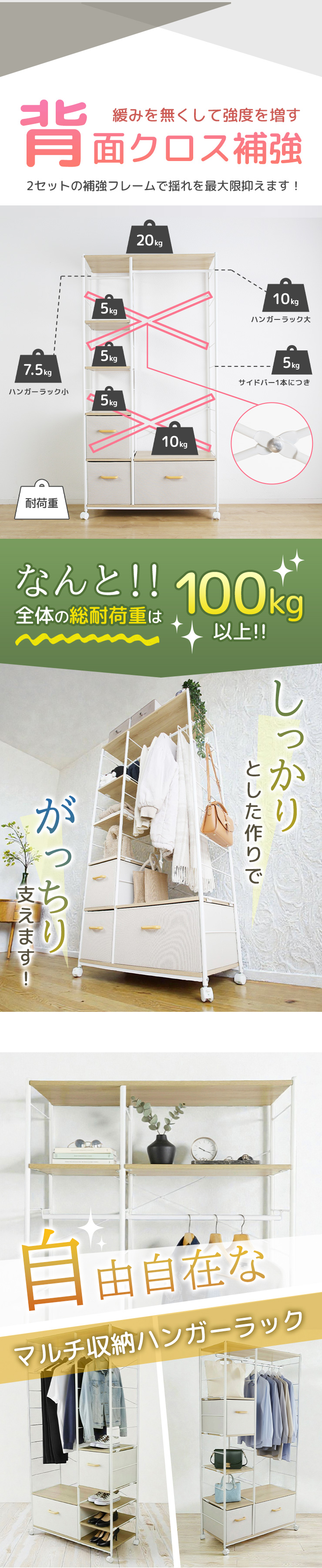 ハンガーシェルフ ハンガーラック ワードロープ 収納 おしゃれ シンプル 頑丈 キャスター 棚付き 上棚 引き出し ケース 大容量 マルチ 可動棚 高さ調節