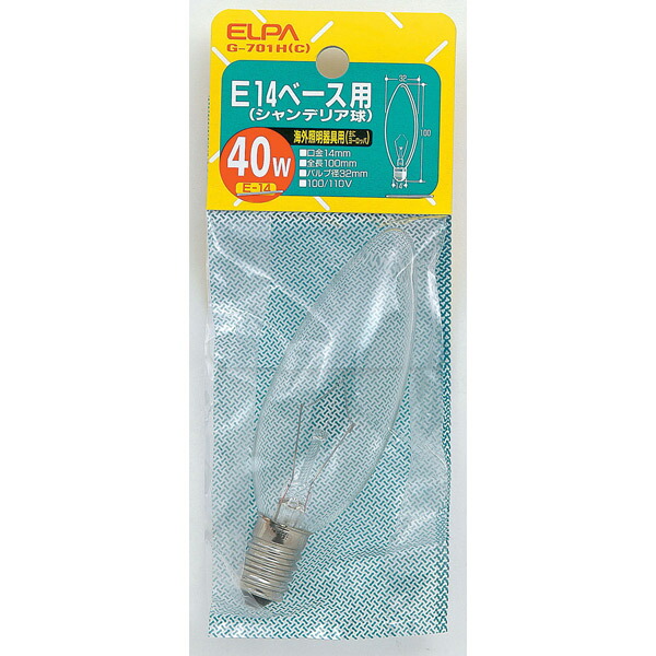 □海外照明器具用(主にヨーロッパ)。□E14ベースはヨーロッパの照明器具に多く使われています。□ガラス球の形状がローソクの炎形の電球。シャンデリア器具にはもちろん、電球の形やフィラメントの輝きを見せるブラケット、ペンダントにも使用できます。□定格: ・電圧 100/110V ・消費電力 40W ・寿命:約1,500時間□本体サイズ: ・全長:100mm ・バルブ径:32mm ・口金:E14□入数:1個□カラー:クリアJANCD:4901087098491【銀行振込・コンビニ決済】等前払い決済予定のお客様へ当商品は弊社在庫品ではなく、メーカー取寄せ品でございます。在庫確認後に注文確認を行い、お支払いのお願いを送信させて頂きます。休業日、14:00以降のご注文の場合は翌営業日に上記手続きを行います。お時間が掛かる場合がございます。