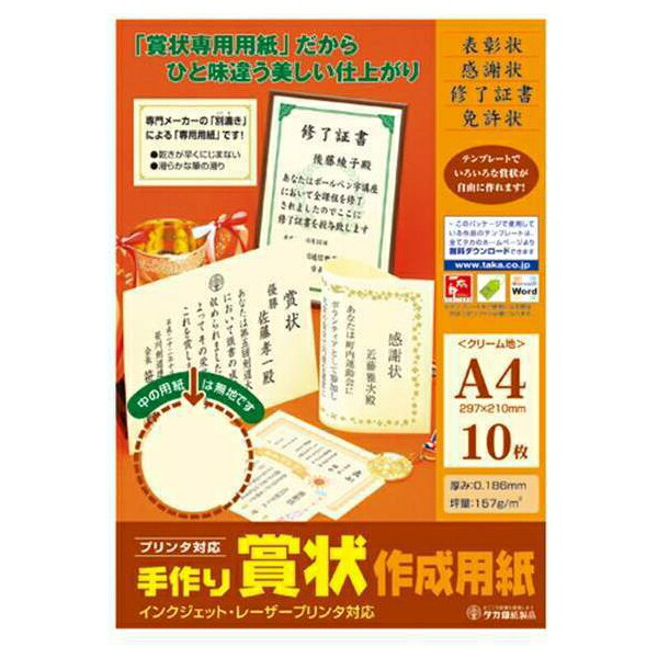 ササガワ 手作り賞状作成用紙 無地 (枠なし)・縦横兼用 クリーム 10枚 10-1967