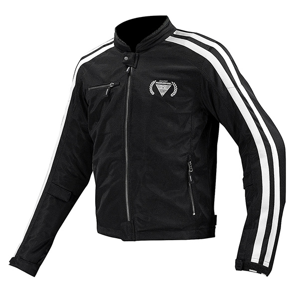 袖の二本ラインが特徴的なクラシックテイストのフルメッシュジャケット。胸と背中にはリフレクターを兼ねるロゴをプリントで配置。