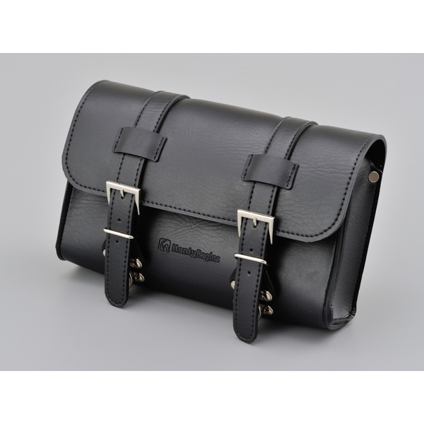 収納場所が無いハーレーや国産アメリカンなどに工具や書類を積載できるツールバッグ。固定ベルトの取り付け穴が縦・横に開いているので、ハンドルバーやダウンチューブ、シーシーバーなどにも取り付け可能です。
