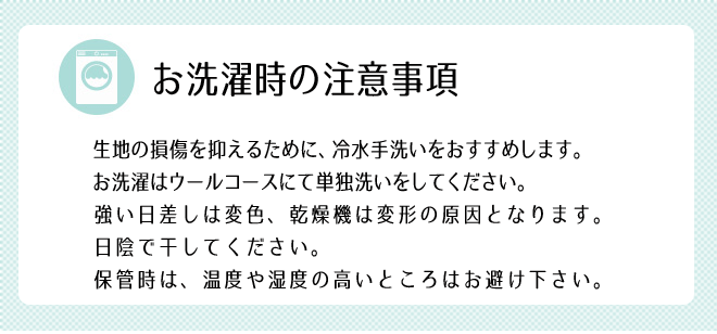 | 注意点 | ◆ご購入前 ・商品を複数回または複数個ご購入された場合、生産ロットや入荷時期等の理由により、色、質感、加工、柄パターン等に差異がある場合がございますのでご了承ください。 商品差異が気になる場合はご購入前にお問い合わせください。可能な限りご希望に添えるよう努力いたします。 ・お買い物ガイドをお読みのうえご購入ください ・サイズ表をお確かめの上ご購入ください ・サイズにつきましては±3%の誤差は許容範囲内として販売しております。 ・ご利用のデバイスやPCモニタのカラー設定等により若干異なった色に見える場合がございますが、何卒ご了承ください(赤が青に見える等、明らかに色が異なっていた場合は返品交換の対象となります) ◆ご購入後 ・段ボールやビニール袋は返品・交換・返送の際に必要になります。これらを破棄されますと、返品をお断りさせていただく場合がございますので、お届けした商品の中身の確認が済むまでは保管してください。 ※段ボールやビニール等袋を破棄されますと、不良品であっても対応をお受けできなくなる場合がありますのでご注意ください。 ・商品が届きましたら、お早めに商品カラー等のご確認をお願いいたします ・商品到着後、1週間を過ぎたご返品は基本的にお受けできません ◆ご使用時の注意事項 ・中性洗剤を使用し、冷たい水で手洗いか洗濯機のウールコースで単独洗いしてください。 ・長時間の脱水を避け、ねじって絞らないでください。 ・強い日差しを避け、日陰で干してください。 ・保管は温度や湿度の高い場所を避けてください。 ・乾燥機は使用しないでください |