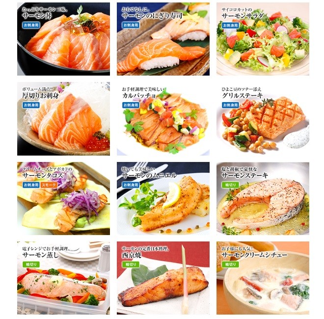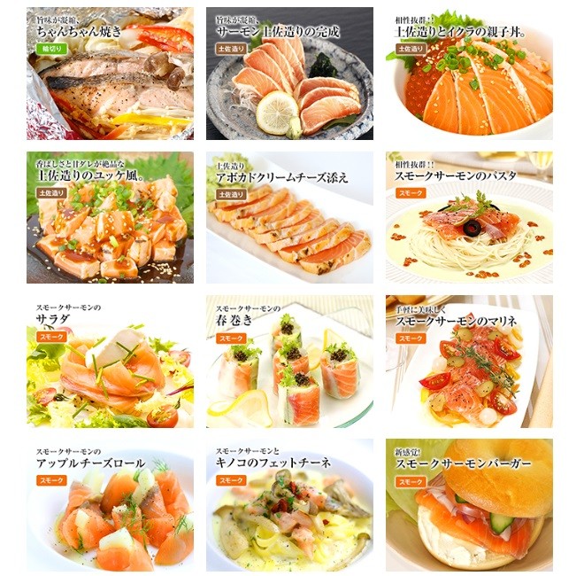 刺身 グリル 焼き魚 焼き鮭 スモーク 燻製 マリネ カルパッチョ サラダ フリット フィッシュアンドチップス ステーキ 西京焼き ムニエル バター焼き サーモン丼 どんぶり サンドイッチ サンドウィッチ ベーグル おにぎり おむすび 寿司 すし