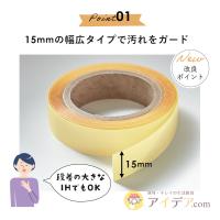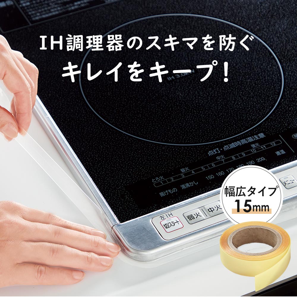 IH調理器の保護テープ クリア(15mm幅)           お料理するたびに溜まるIHの隙間の汚れ…。 布巾で拭いても中に入り込んだ汚れは取れにくいですよね。 「IH調理器の保護テープ」で隙間を防げばお掃除もラクになりますよ! 汚れカスが入り込まないのが嬉しいポイント。 はがすだけできれいになるので、キッチン周りをきれいに保つことができます。 ご要望の多かった幅広タイプ&貼りやすい中央スリットタイプになってリニューアルしました。