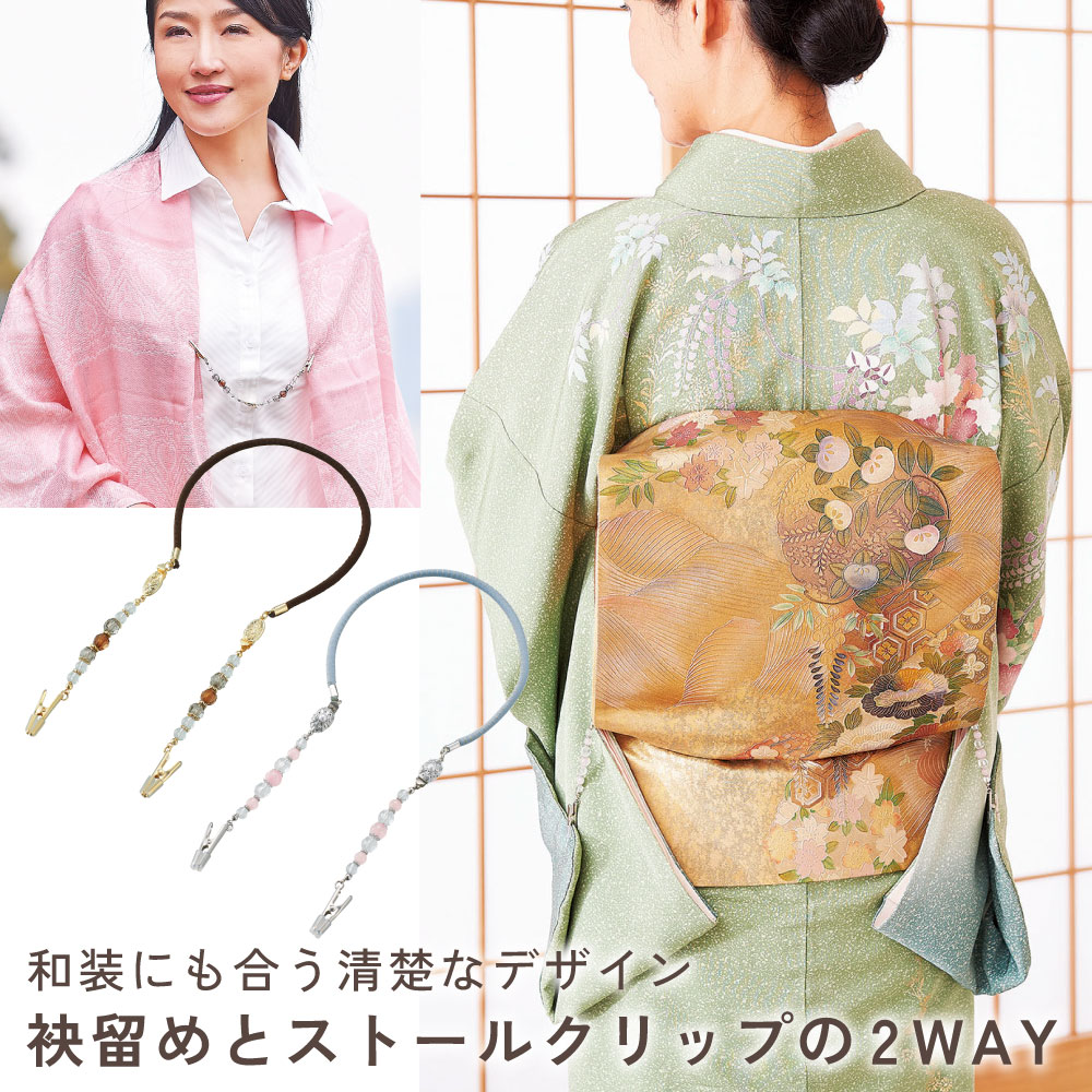 [使用上の注意]]●袂留めとしてご使用になる場合は、着物や帯などに引っかけないよう十分ご注意ください。●お子さまが本品で遊ばないようご注意ください。●使用時に首をしめつけないよう十分ご注意ください。●マフラー・ストール・着物などの厚み、材質やデザインによっては取り付けられない場合がございます。また付けるものの材質により、クリップが滑って外れやすい場合がございますのでご了承ください。●クリップ部のカバーが破損した場合は、ご使用にならないでください。●本品を取り外すときは、必ずクリップを開いてから外してください。クリップを開かず強く引っ張ると、生地を傷めたり、本品が破損する恐れがあります。●火気に近づけないでください。●本来の用途以外には使用しないでください。