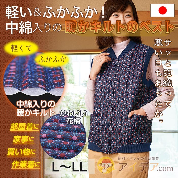 部屋着 ルームウェア 防寒 ベスト 花柄 普段着 日本製 作業着 ポケット付あったかキルトベストL-LL コジット