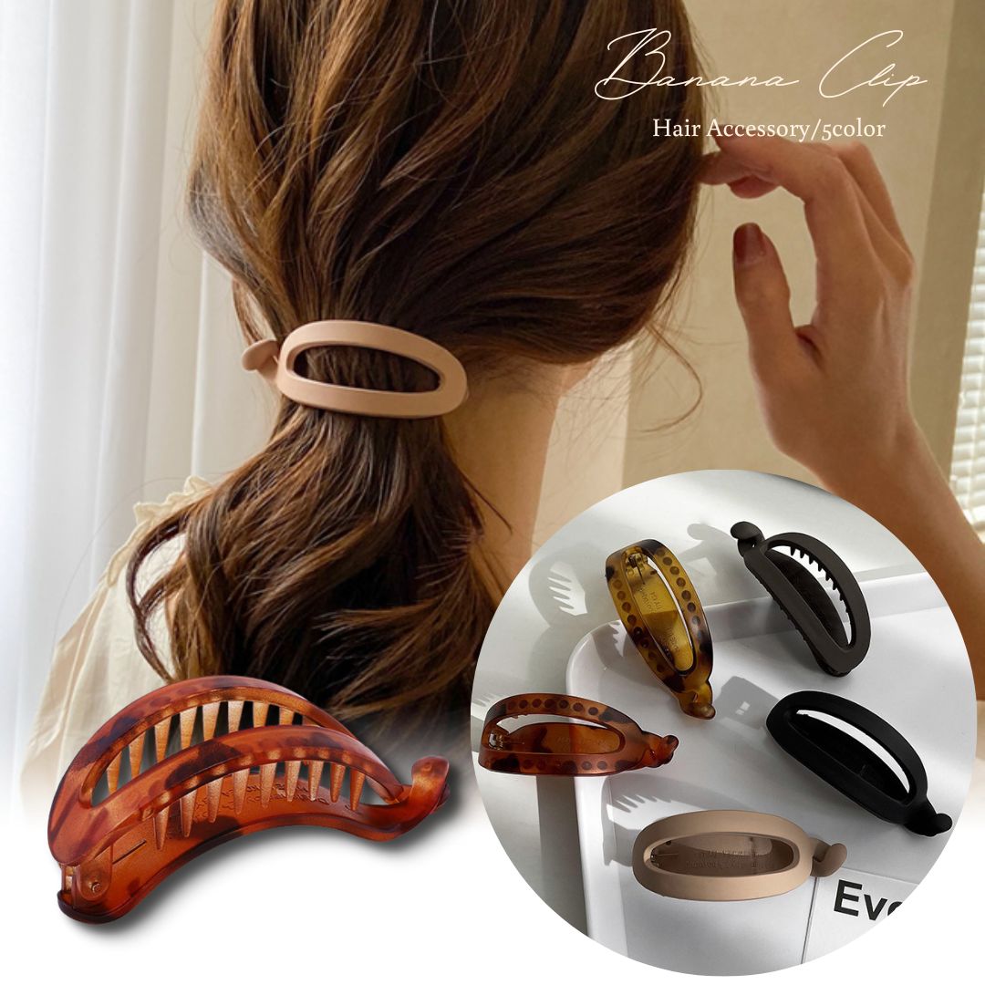 【商品説明】ホールド力抜群、馴染みやすいべっ甲柄とマットカラーがおしゃれなバナナクリップ。ぷっくりと湾曲したクリップと内側の長さのあるツメが髪の毛をしっかりキャッチしてホールド。ヘアスタイルが一日中キープされて崩れない万能クリップです。リングタイプのデザインもヘアスタイルをおしゃれにスッキリと見せてくれます。
