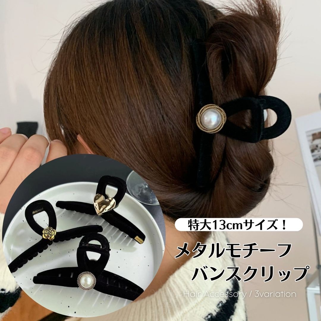 ベロアバンスクリップ ヘアクリップ パール ハート 秋冬 もこもこ 特大 大きめ 13cm ヘアークリップ ローズ バラ お花 ヘアアクセサリー おしゃれ CR-118