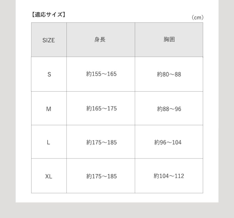 | 適応サイズ | S(身長:約155〜1165cm、胸囲:約80〜88cm)、M(身長:約165〜175cm、胸囲:約88〜96cm)、L(身長:約175〜185cm、胸囲:約96〜104cm)、XL(身長:約175〜185cm、胸囲:約104〜112cm) |