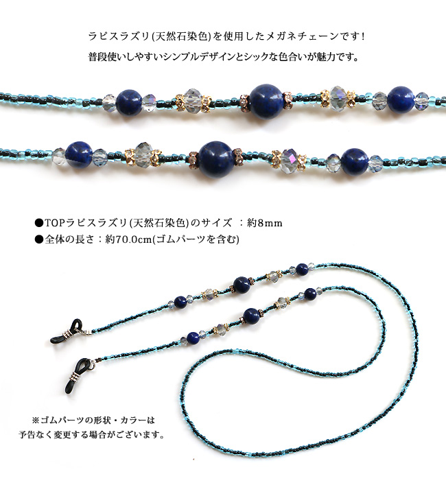 商品名:メガネチェーン 眼鏡チェーン メガネストラップ 眼鏡ストラップ グラスコード おしゃれ メガネホルダー 天然石 ラピスラズリ染 瑠璃石 メガネチェーン 手作り ハンドメイド メガネチェーン70センチ