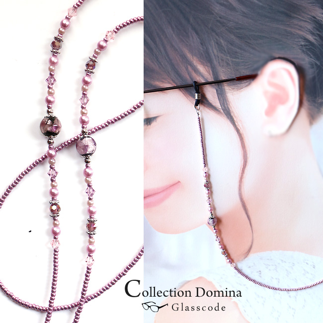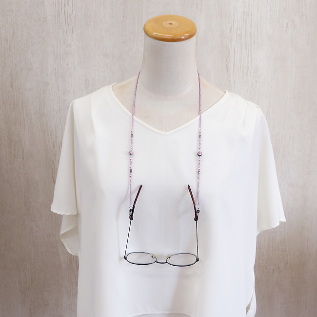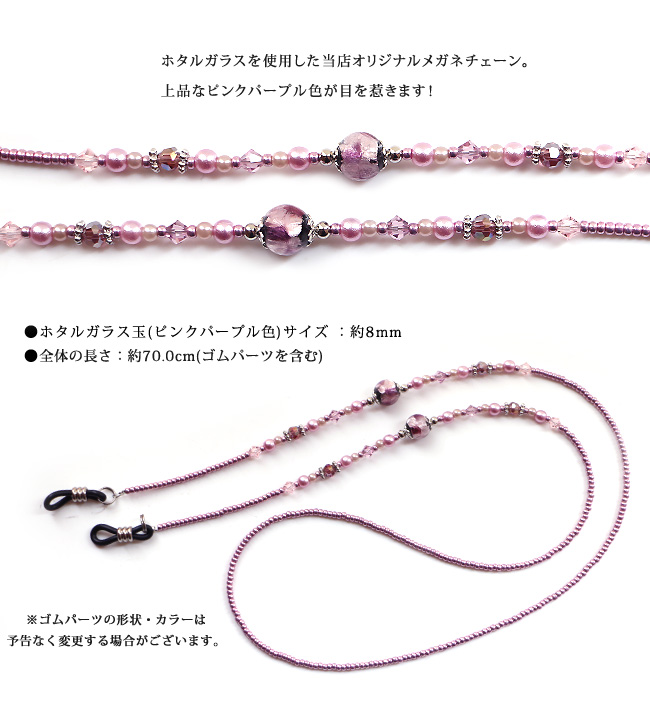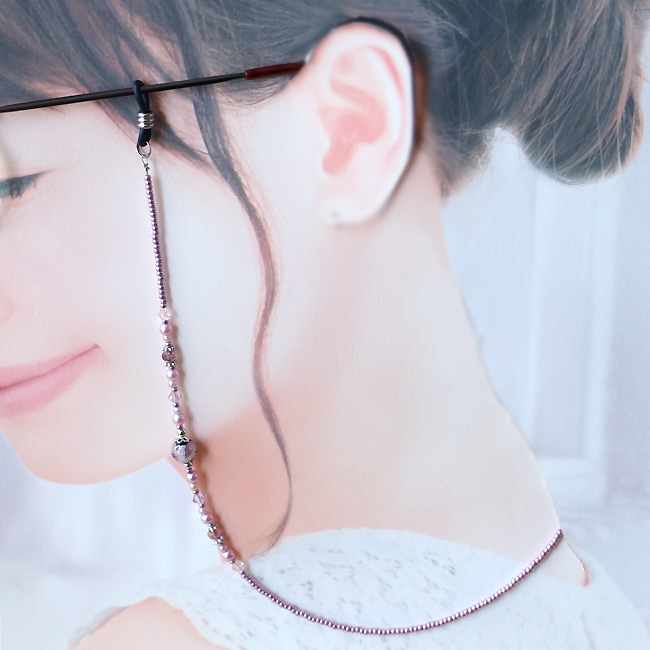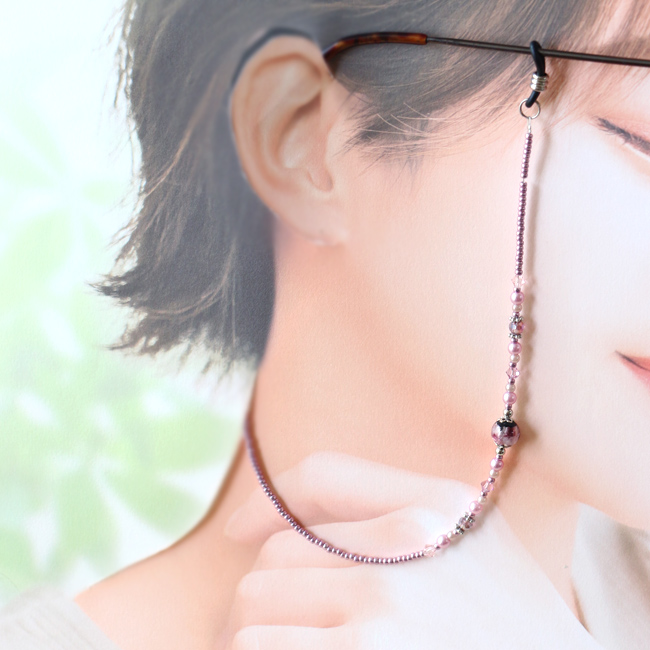 ホタルガラスを使用した当店オリジナルメガネチェーン。上品なピンクパープル色が目を惹きます!