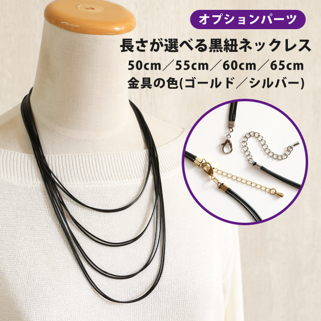 黒紐は4種類(約50cm、約55cm、約60cm、約65cm)の長さから、金具のカラーは2色(シルバー、ゴールド)からお選び頂けます。