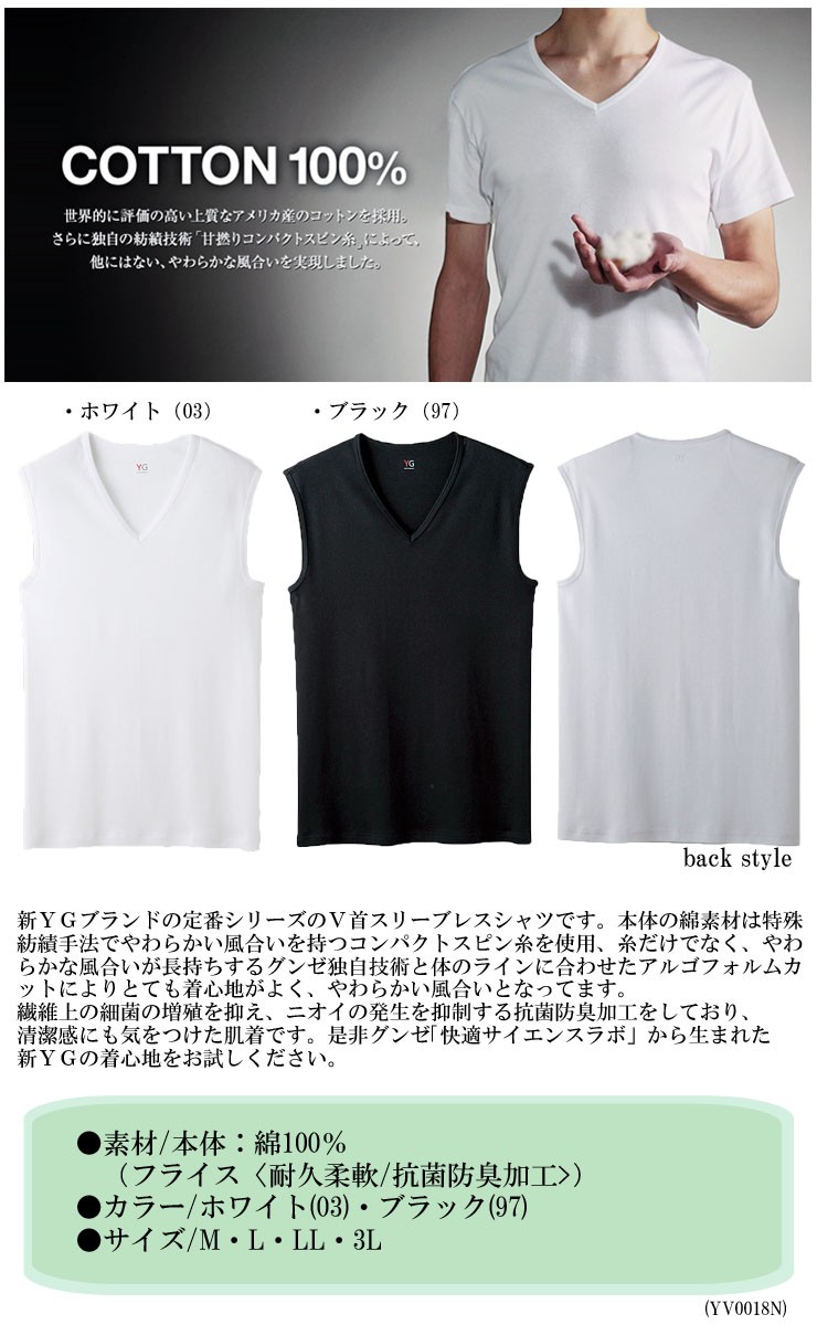 グンゼ【YG】Vネックスリーブレスシャツ(YV0018)/サイズM,L,LL,3L/下着/下着メンズ/Tシャツメンズ/Tシャツ半袖/Vネック/スリーブレス/YGTシャツ/YGインナー/白/シロ/インナーメンズ/(00109)