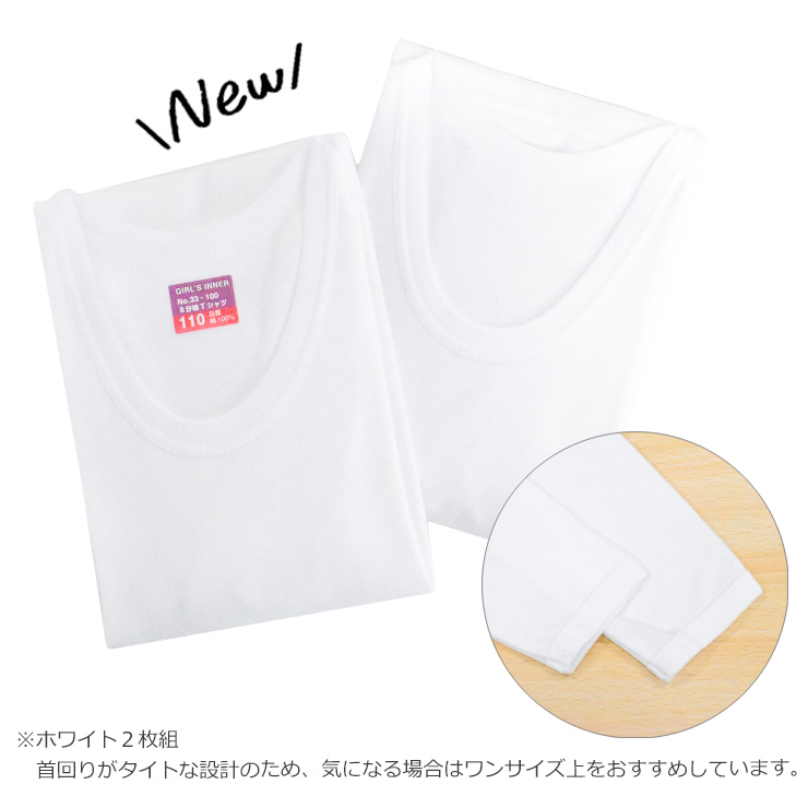キッズ ジュニア 女の子 8分袖スリーマ 2枚組 綿100% 女の子 インナー 子供 インナー 長袖 キッズ インナー 長袖 長袖インナー キッズ 女児 肌着 スクール 白 ホワイト